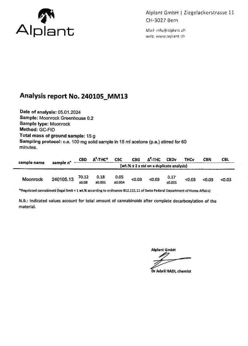 Fantastic Moon Rocks, produced in Switzerland and grown without the use of pesticides or other sprays. The manufacturer produces these Moon Rocks by dipping a high-quality bud in organic CBD oil, then dipping the now sticky bud in luxury pollen. This creates a truly exquisite product that can only be recommended. Very compact and potent Moon Rocks, with truly outstanding quality across all parameters. The consistency is described as dense and compact.