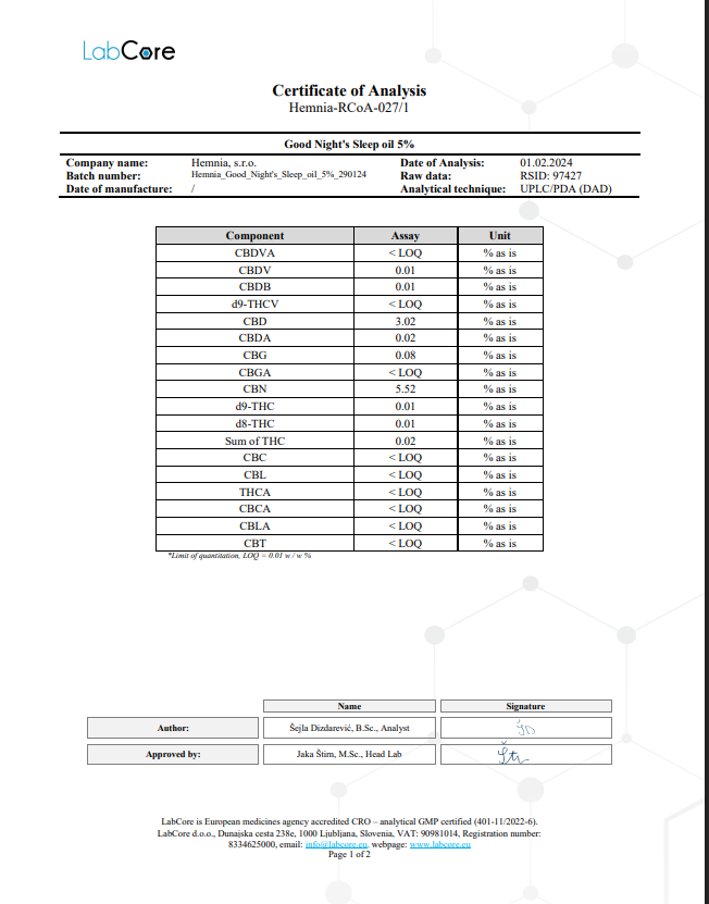 - Ingredienser: Hampefrøolie, hamp ekstrakt (CBN, CBD)